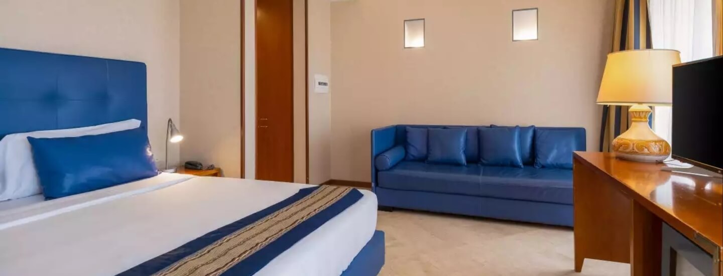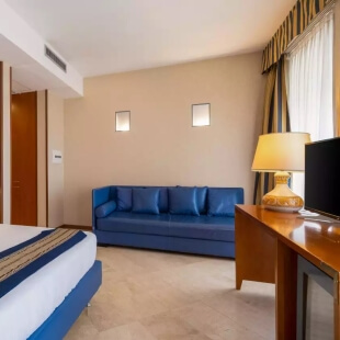 Il bagno con cabina doccia in cristallo è l'ambiente ideale per rinfrescarsi dopo un bel tour culturale o una dura giornata di lavoro. ll minifrigo e la cassaforte a misura di computer portatile completano gli accessori. La camera dispone di un letto queen size e un letto singolo al piano inferiore e due letti singoli al piano superiore.